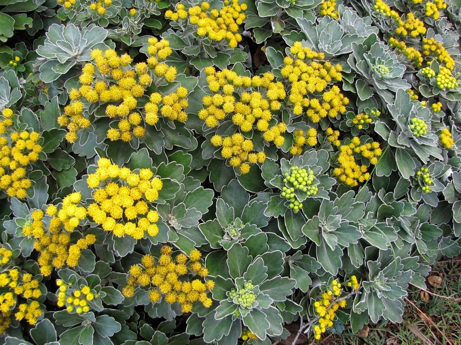 Саженцы Аянии Тихоокеанской (Ajania pacifica) стоят в родстве с обычными хризантемами, но значительно превосходят их своей неординарной внешностью. Многолетник растет в виде шаровидного пышного кустика, высотой не более 30 сантиметров. Побеги покрыты ярко-зелеными зубчатыми кожистыми листьями. Соцветия состоят из множества желтых пушистых шарообразных цветочков, чем то напоминающих веточку мимозы.