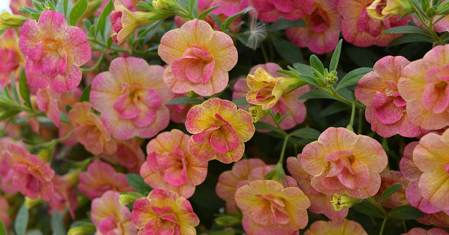 Саженцы калибрахоа Дабл Пинк Йеллоу (Calibrachoa Chameleon Double Pink Yellow) – популярный сорт-хамелеон с махровыми желто-розовыми цветками.