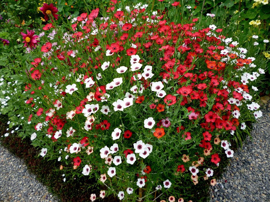 Семена льна крупноцветкового "Очарование" высевают сразу в открытый грунт в конце марта — апреле на солнечный участок с хорошо дренированной почвой. Это эффектный кустистый однолетник высотой 45-50 см, шириной 15-20 см. Растение с узкими светло-зелеными листьями и довольно крупными пятилепестковыми цветками контрастной белой и красной окраски. Цветет сорт с июня до сентября. Лен крупноцветковый "Очарование" идеально вписывается в мавританский газон, отлично гармонирует со многими засухоустойчивыми и солнцелюбивыми культурами.