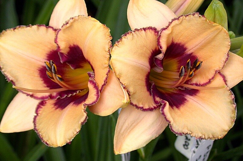 Рассада лилейника гибридного Алагва (Alaqua) порадует потрясающей расцветкой. Кремово-бежевые лепестки цветка к середине становятся пурпурными. Края лепестков украшает такая же темная окантовка. В центре соцветия расположены желтые тычинки с черными головками. Этот сорт используют для оформления берегов водоемов, создания ярких разноцветных композиций. Высота взрослого куста достигает 65 см. Растение отличается неприхотливостью и способностью адаптироваться к любым условиям. Цветет лилейник в июле. Цветы источают приятный сладковатый аромат.