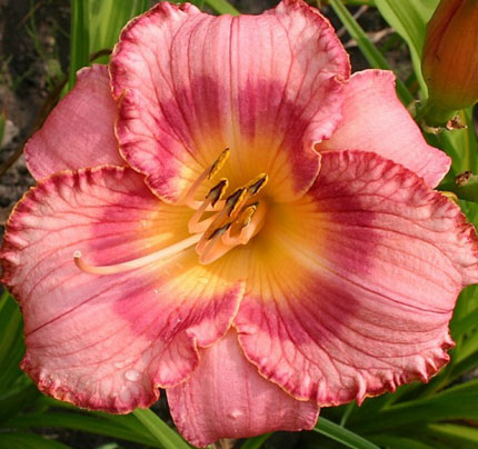 Окраска цветка : Лососево-розовый, с ярко-розовым кольцом и каймой и с жёлтым центром