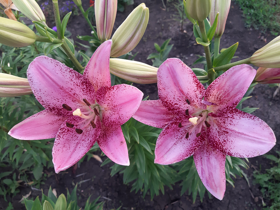 • Окраска цветка : крупный, перламутрово-розовый с редким бордовым напылением по краям лепестков и у центра, пыльники темные