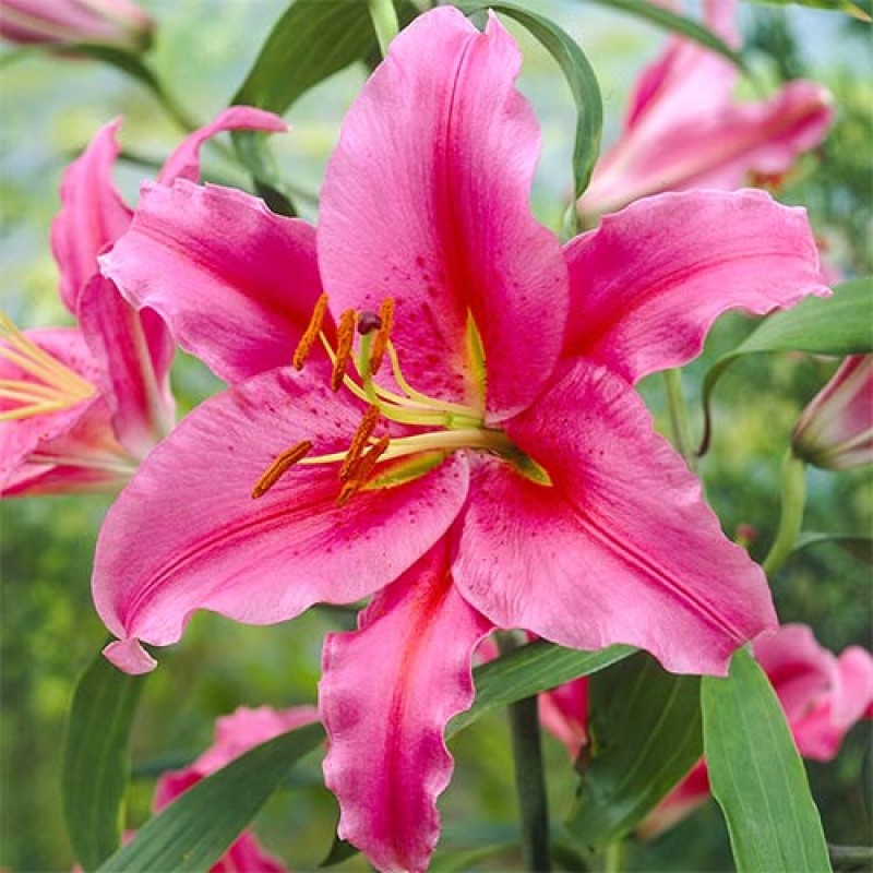 Луковицы лилии восточной Акапулько (Acapulco) – сорт, достойный самого выгодного места в саду, откуда будет радовать своим ярким цветением теплыми летними днями. Изюминка цветков – в слегка гофрированных лепестках с темными мазками и красными крапинками. Ярко-оранжевые рыльца добавляют соцветиям контраста. На прочных длинных побегах умещается несколько соцветий.