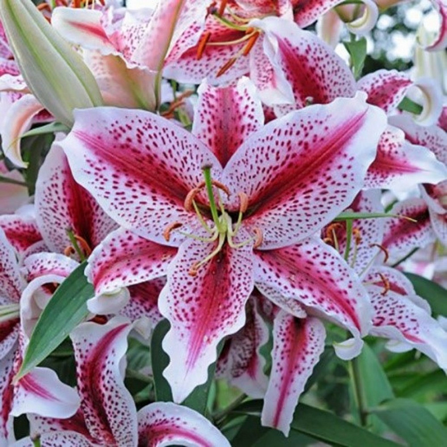 Луковицы лилии восточной Солюшн (Lilium hybrid oriental Solution) принадлежат к очень нарядному сорту с крупными ароматными цветами. Многолетник эффектно смотрится в групповых и смешанных посадках, в букетах. Цветки крупные, в диаметре достигают 20-22 см. Раскрытые бутоны отличаются белоснежным фоном, на котором выигрышно смотрятся желтая звезда, расположенная в центре, ярко-малиновый крап и мазки. Высаживать лилию восточную Солюшн следует в сухую, рыхлую, питательную, водопроницаемую почву на хорошо освещенные, защищенные от ветров места.