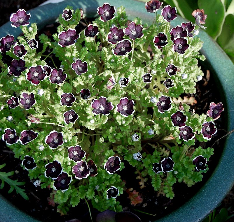Семена немофилы обыкновенной (Nemophila menziesii) Пенни блек, высаженные в апреле, дадут вам цветущий с июня по сентябрь удивительный по красоте экзотичный коврик. Все дело в необычной окраске цветков этого сорта — лепестки имеют почти черный цвет и белую кайму по краям. Цветы одиночные, мелкие, около 3 сантиметров в диаметре. Листья удлиненные, перистые. Стебли стелющиеся, до 15 сантиметров высотой. Чтобы получить плотную полянку цветов и зелени, семена следует высаживать на расстоянии 10-20 сантиметров друг от друга. Немофила предпочитает полутень и влажный грунт. Выигрышно смотрится в рабатках, бордюрах, горшечных композициях.